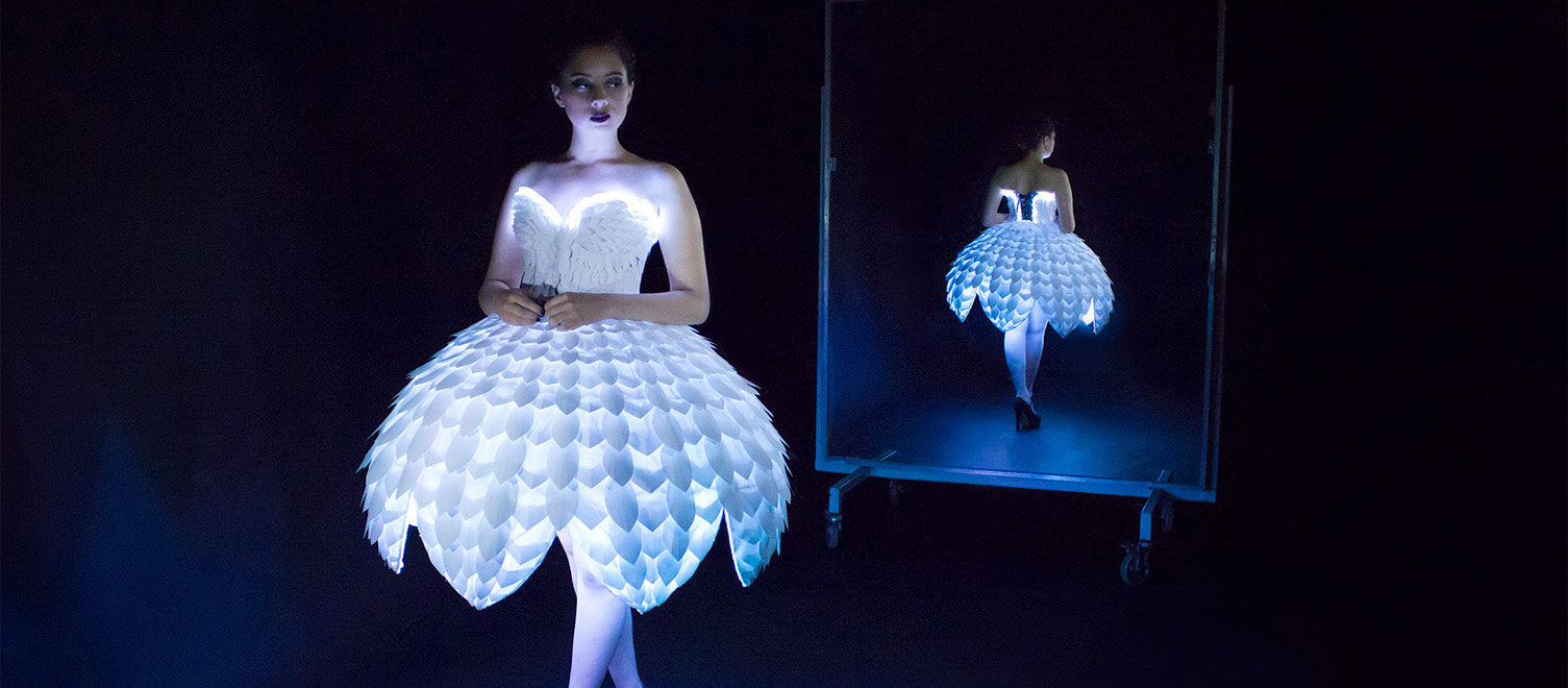 It was extremely important to us to make our piece of wearable art into a piece of wearable technology, by integrating lights and circuitry seamlessly into the design. Because garments in the World of Wearable Art show move between light and dark spaces on stage, it was crucial that the garment was striking in both environments.