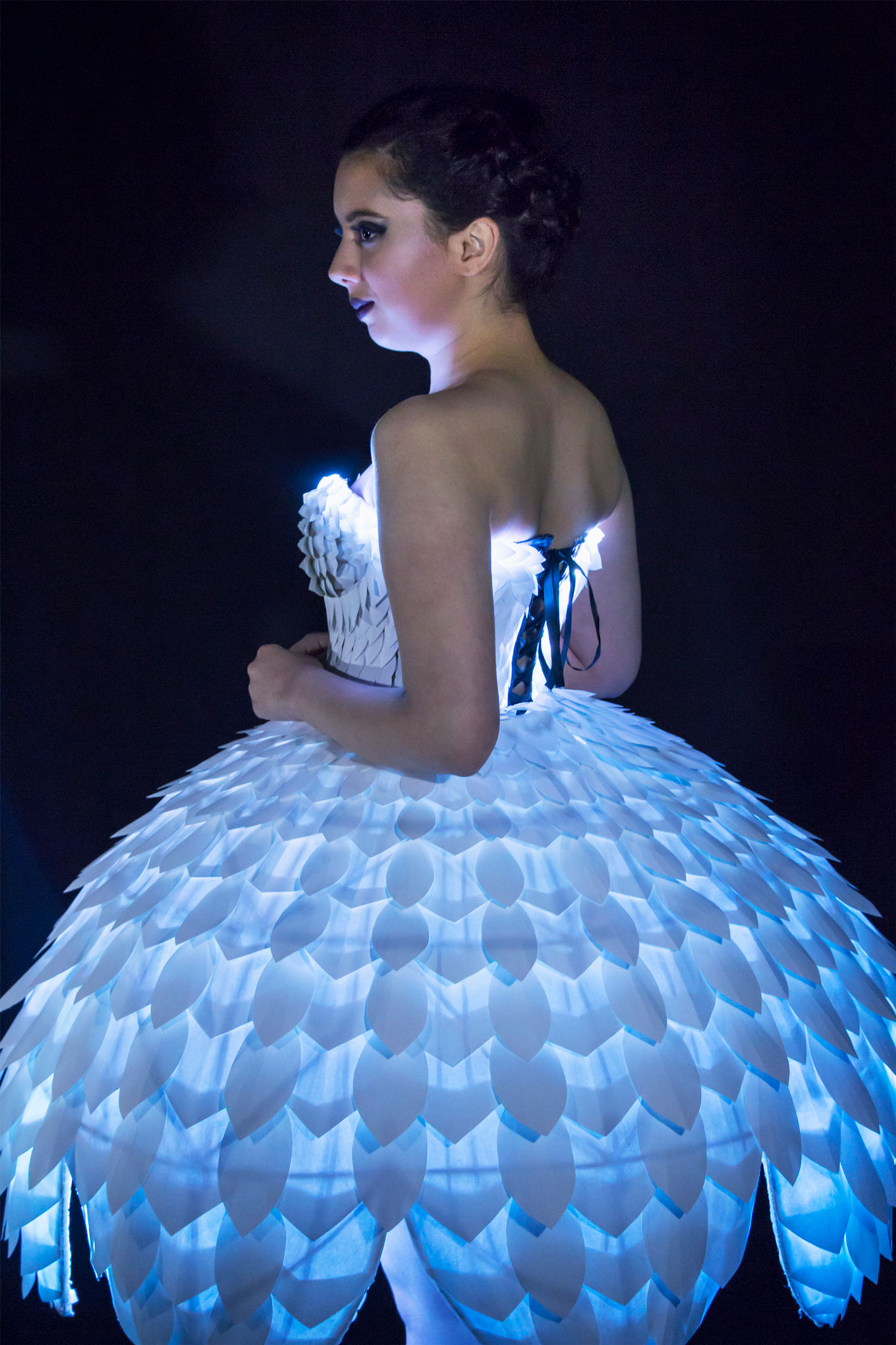 Integrated into the edge of the dress and bodice are hundreds of addressable NeoPixel LEDs. An Arduino Lilypad controls the functions of the lights, allowing each individual LED to be programmed to any behaviour or RBG colour. These lights diffuse underneath the paper dress, allowing the garment to bloom, transforming it into a wearable light show. A switch runs through the different light behaviours, from a simple fading breathing pattern to a rainbow light chase.